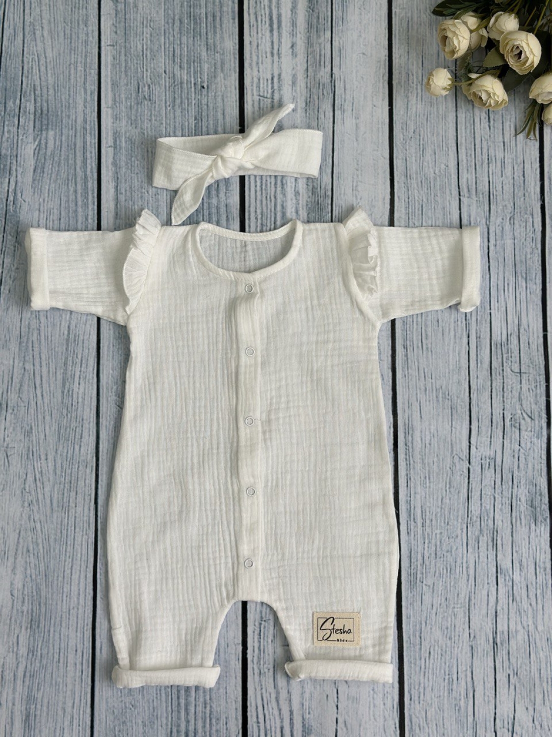 336-МО. Комбинезон с повязкой для девочки из муслина, хлопок 100%, размеры 56,62,68, молочный